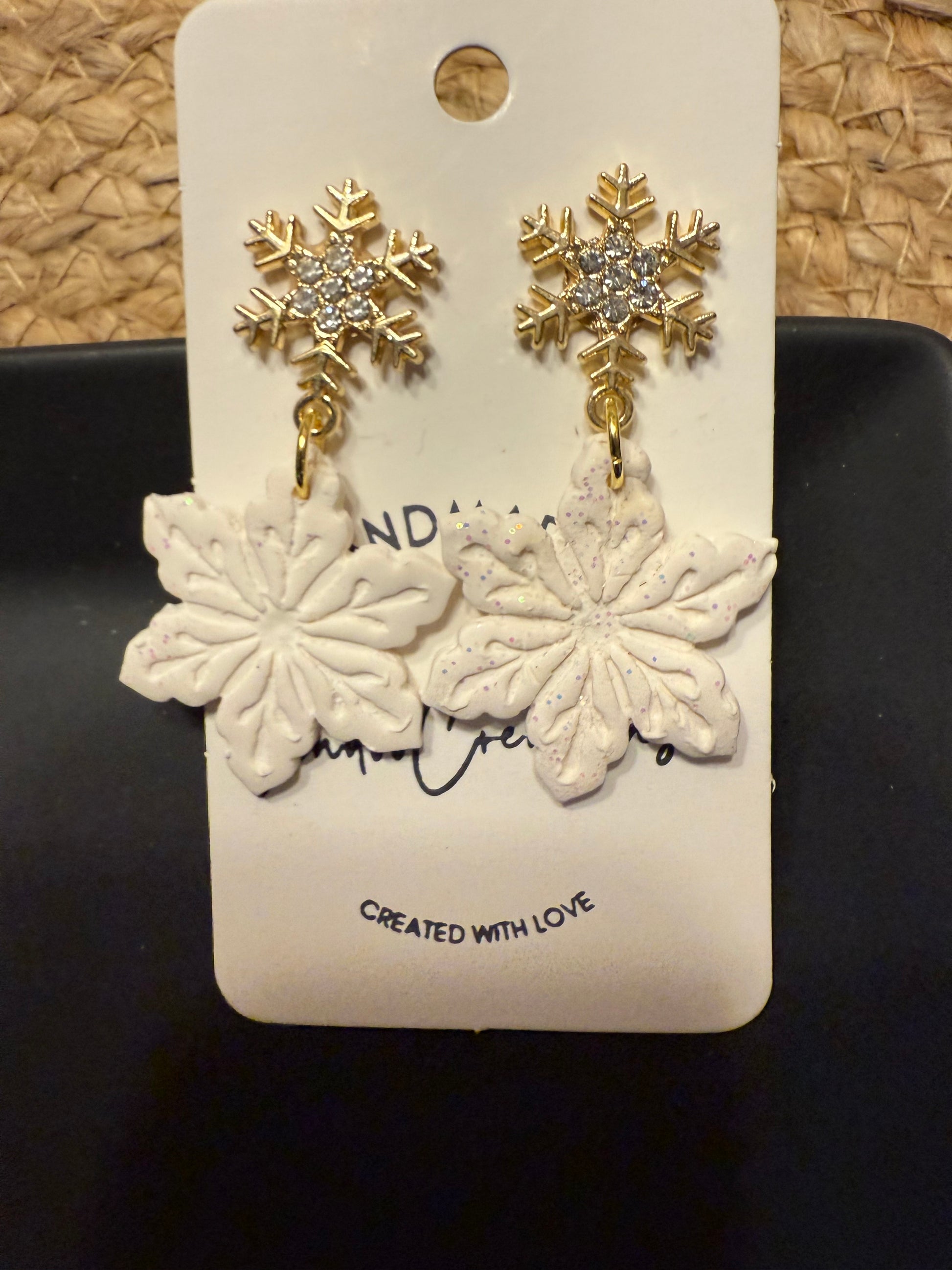 Sparkly white Snowflake clay earrings handmade lightweight Holiday Christmas Winter gold snowflake stud