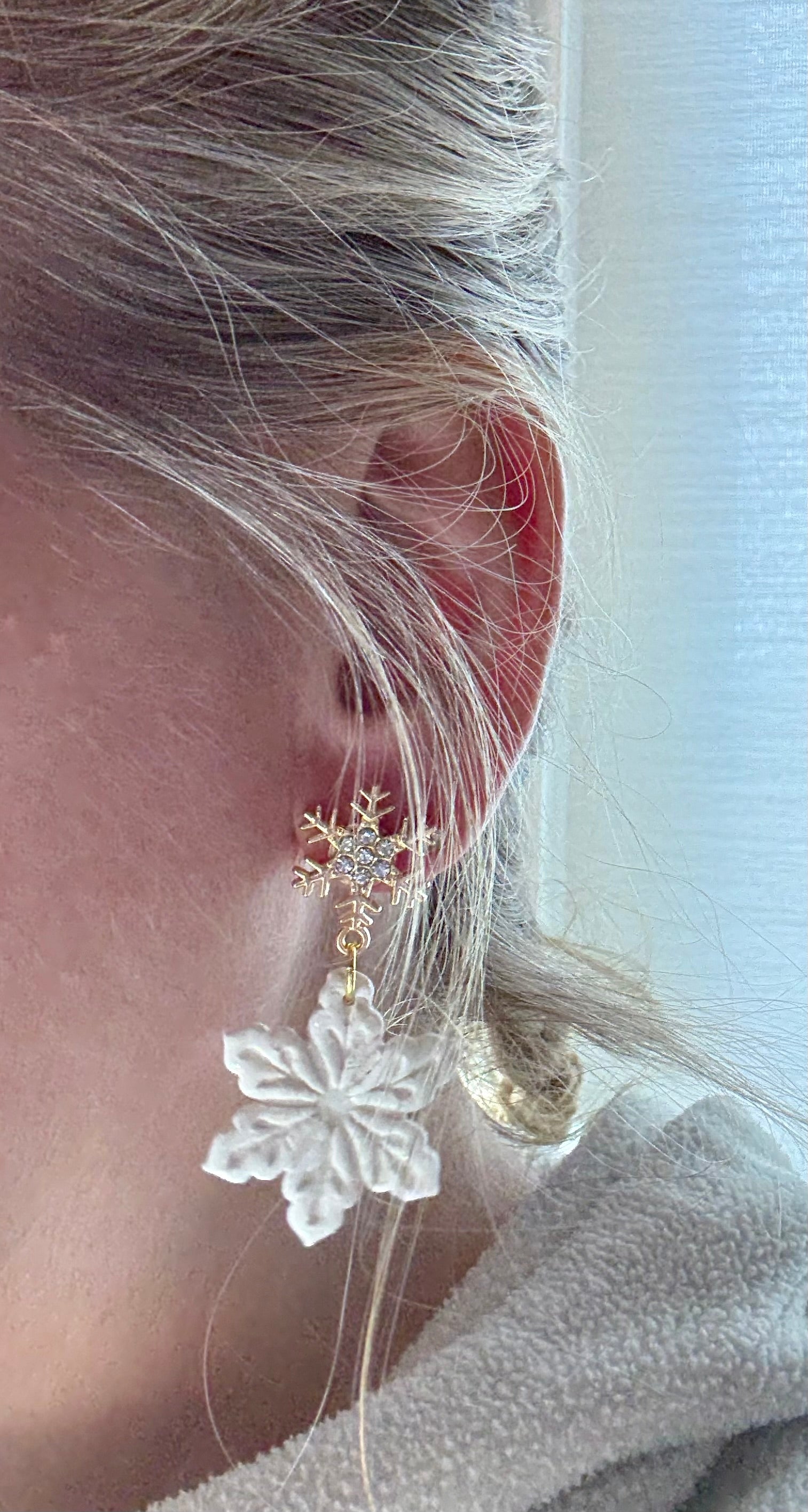 Lightweight, clay snowflake earrings in white with texture, glitter and sparkle